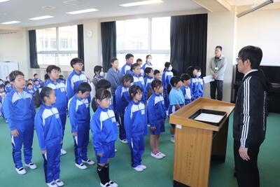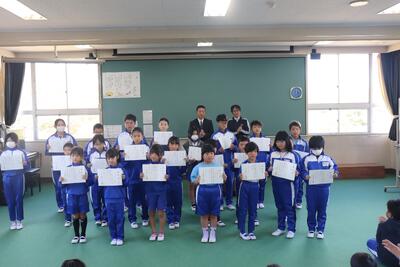 本日、「なかよしタイム(業間)」に若鯉広場で表彰式と認証式が行われました。表彰式では、標語「ふみだそう 小さな勇気と やさしい手」で香取市人権標語展で優秀賞を受賞した6年生が表彰されました。認証式では、後期の学級役員である会長、副会長、書記に任命された児童一人一人に認証証が手渡されました。次の表彰式では、絵画や書画で入賞された児童への表彰が予定されています。たくさんの北小児童が受賞されることを期待しています。(ぜひ、図書委員会の読書フェアを活用して「しおり」も「読書賞」も獲得してください。)