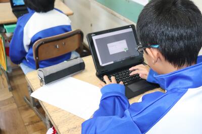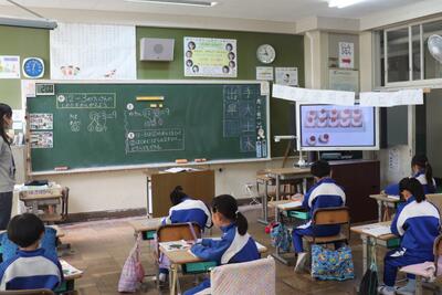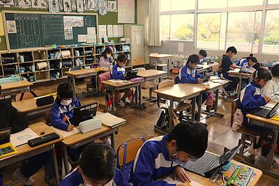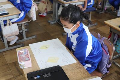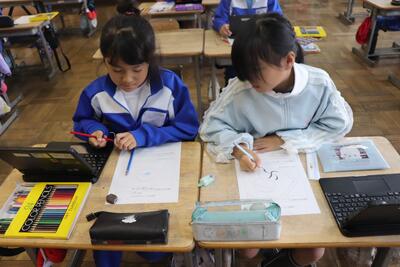 国語の授業では、「世界の人に伝わるように」ということで「絵文字を考える」内容を行いました。児童は配られたプリントに、自分で考えた絵を描いていました。児童ならではのアイデアで作られた絵文字(デザイン)の完成が楽しみです。