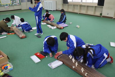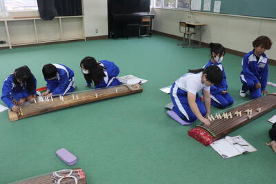 音楽の授業では、日本の伝統楽器である「琴の演奏」を行いました。曲は「さくらさくら」です。教科担任の先生の説明を聞いてから、3人グループに分かれて、曲を演奏しました。指に爪をはめての演奏で始めは戸惑っていた様子でしたが、意欲的に取り組んでいました。