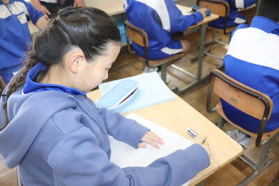 理科の授業では、「日光の焦点」について学習しました。メガネや鏡でできた光をどのように集めると温度があがるかをペアやグループで話し合いました。出し合った考えをプリントにまとめたので、次の実験等で確認する予定です。
