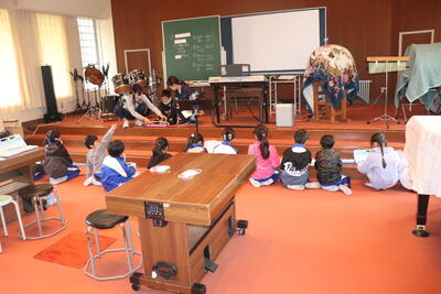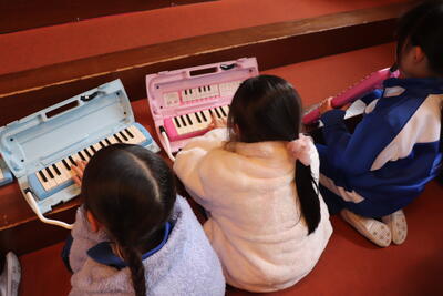 音楽の授業では、音楽堂で授業を行いました。「カエルの合唱」を鍵盤ハーモニカを使って演奏しました。グループで行った輪唱はとても上手にできました。その後は、自分の机に戻って、鍵盤ハーモニカで「子犬のマーチ」を練習しました。