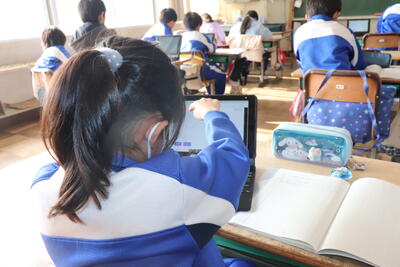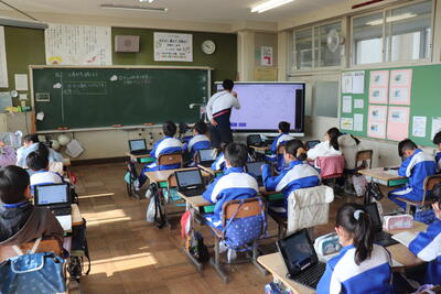 算数の授業では、「図形」について学習しました。担任の先生が電子黒板に表した図形を各自タブレットのアプリを使って学びました。タブレットで画面の図を手元で操作しながら「正三角形」や「二等辺三角形」等を確認しました。
