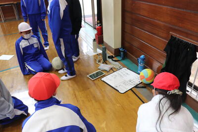 体育の授業では、「ゴール型(ハンドボール)」を行いました。今日は、簡易ゲームでパスをつなげるゲームです。ドリブルなし、シュートはゴールに見立てたマットの近くのみなので、ボールをもっていない児童の動きがポイントになりました。ゲームをやっているうちに、パスがつながりシュートまでいくことができました。