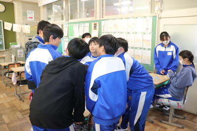 学級活動の時間では、卒業プロジェクトの一環である「全校(一斉)遊ぼうデー」の準備をしていました。グラウンドに出て、企画を担当している児童を中心に並び方や開閉会式、レクリエーションの説明等、動きの確認を行いました。寒い中、学校全体のために取り組んでいる6年生の姿は、大変素晴らしいと思いました。