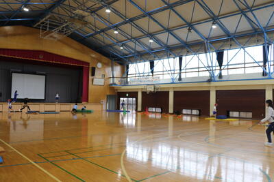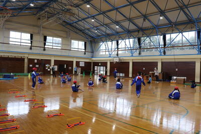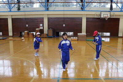 低学年合同体育の授業では、「縄跳び」を行いました。各自でプリントに載っている技の取得に挑戦しました。また、一番長く跳び続けることを競い合いました。「がんばれー」という声がたくさんあがっていました。最後は、輪っかをけんけんで跳ぶなどしてから戻ってくるリレーを行いました。 こちらも応援をしながら元気に取り組んでいてよかったです。
