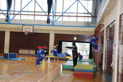 体育の授業では、低学年合同で体育館に移動して行いました。はじめになわとびを行い、検定や記録に挑戦しました。次に担任の先生方が考えて工夫して作ってくれたアスレチックのようなサーキットコースを元気よく走り回りました。いろいろな動きがあり、楽しく取り組めました。