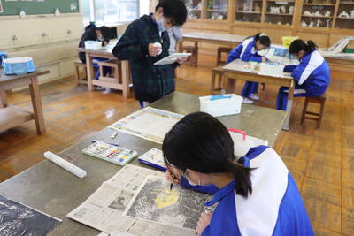 図画工作の授業では、版画を行いました。彫刻刀で彫るのが終わった児童から刷り始めました。完成した作品をみてうれしそうでした。今回、彫刻刀を使って彫る作業がほとんど終わったので、次回はほぼ全員が刷ることができるとのことでした。