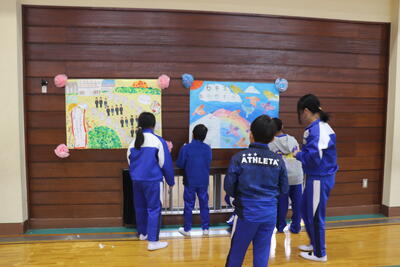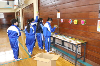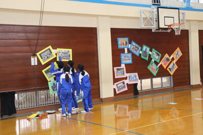 4年生と5年生が合同で、明日予定している「6年生を送る会」の準備を行いました。各クラスごとに6年生に向けたメッセージ入りのポスターを掲示したり、体育館の正面や側面に飾りつけをしたりしました。飾りつけと同時にステージでリハーサルを行い、最後に椅子を並べて完成しました。明日の本番が楽しみです。