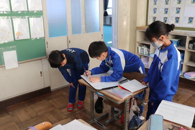 「泣いた赤鬼」では、「赤鬼」と「青鬼」の関係についての変化を教科書から読み取り、ノートにまとめました。仲良しだった関係が、「どのように」、「どうして」変わったのかを考えていました。