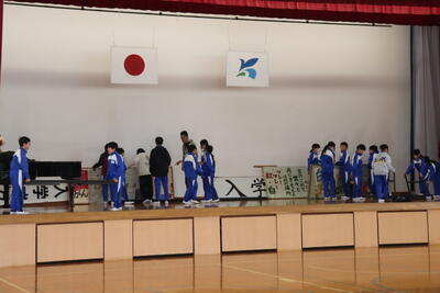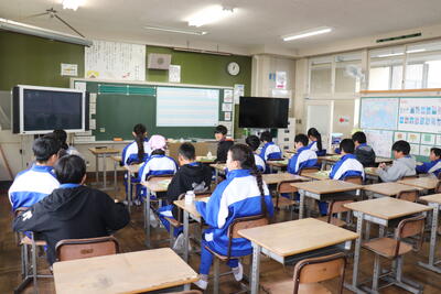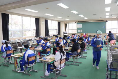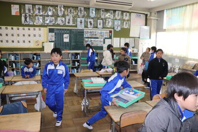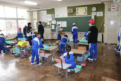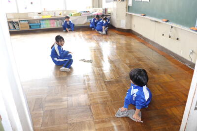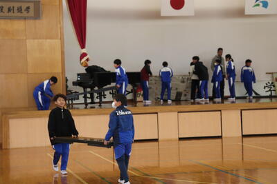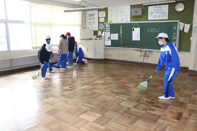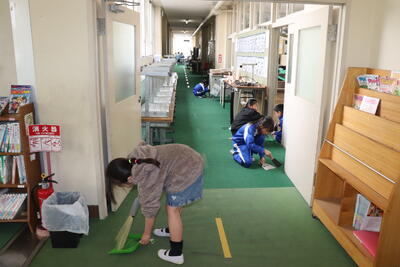 4校時に大掃除を行いました。はじめに6年生が1年生と2年生教室にある机やいすを廊下に運び出してくれました。4年生と5年生は体育館にある机やいす、立て看板などを玄関に運んでくれました。上学年はその後に自分たちの教室の荷物を運び出して掃除をしました。机やいすがなくなり雑巾がけが済んだ教室はとてもすっきりしていました。給食は、1年生が生活科室で、2年生と3年生が図書室で、4年生と5年生が若鯉広場で、6年生がセンダン教室でそれぞれいつもと違う場所で食べました。児童が帰ったあとは、先生方全員で教室や体育館をワックスがけしました。卒業まであと9日、きれいな教室や体育館で卒業式を迎えたいと思います。