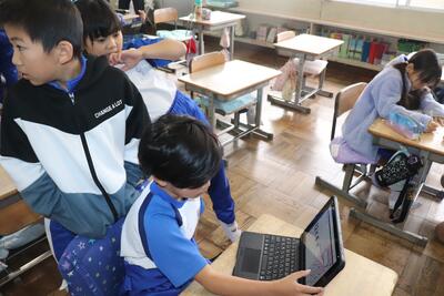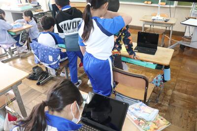 国語の授業では、授業のはじめに各自でタブレットを用意して、タイピングを行いました。小学校ではまず、文字を書くことが大事になります。そして、今後は作文や発表資料等を作る際に、タブレットのワードやパワーポイント等を使って文字を打ち込む技能が必要になるので、継続してタイピングに取り組んでいます。