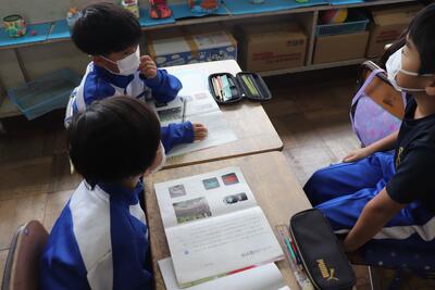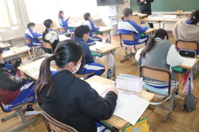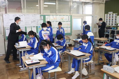 算数の授業では、「比例と反比例」の復習問題に取り組みました。先生から配られたプリントをじっくりと解いていました。その後、友達同士で分からない問題を一緒に考えたり、教え合ったりして確認をしていました。