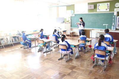 算数の授業では、まとめに入って復習問題に取り組んでいました。教頭先生が用意してくれたプリント問題を集中して解いていました。