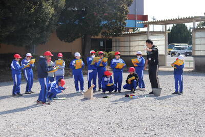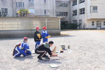 理科の授業では、「気圧」について学習しました。第2グラウンドに移動して、ペットボトルロケットを使った実験を行いました。水の量や空気圧の量を調節してロケットを飛ばして観察し、結果を考察しました。