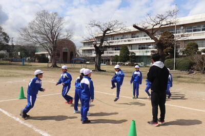 体育の授業では、長縄を使って八の字跳びに挑戦しました。担任の先生からは、リズムや跳んだ後にすぐ出るように説明がありました。連続して跳ぶことが続くと、とてもうれしそうでした。