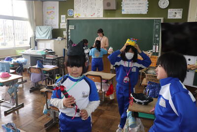 図画工作の授業では、「かぶって変身!」ということで帽子やお面、身に付ける服や道具を作りました。とても工夫した作品が多く、配色やリボンなどの装飾等とてもよく仕上げていました。できた作品は、身に付けて友達に見せ合いました。
