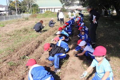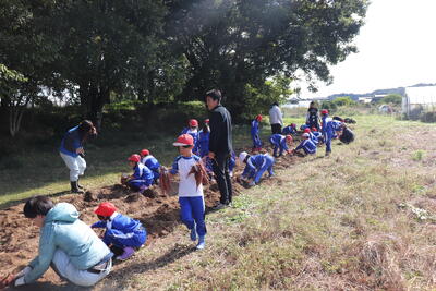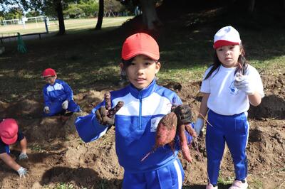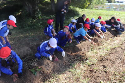 本日、秋晴れの午前中に下学年(1年生から3年生まで)が敷地内にある畑で、栽培したお芋を掘り起こしました。はじめに、JA職員の方が説明をしてくださり、3年生が鎌でつるをきって、そのつるを1年生と2年生がリース作りのために枝を払い集めました。それから全員で芋ほりを始めました。例年通り、楽しく活動でき、たくさんのお芋がとれて児童はとても喜んでいました。後日、焼き芋にして全校児童でいただく予定です。ご指導いただいたJA職員の皆様、写真を撮ってくださったPTA広報担当の保護者の方々、お忙しい中、北小児童のために御協力いただきありがとうございました。
