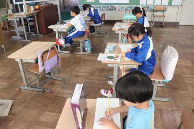 図画工作の授業では、運動会の思い出のシーンの作品を仕上げていました。児童それぞれ、深く印象に残った競技や場面は、親子種目や徒競走、応援など様々でした。初めての運動会が、とても楽しかったことが絵からもよく伝わってきました。
