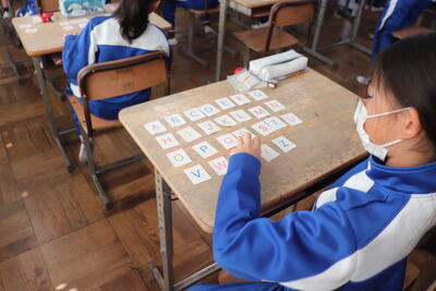 外国語の授業では、「アルファベット」について学習しました。単語カードを使ってAからZまでならべながら、実際に発音する等、楽しく授業を行いました。まずはアルファベットの大文字と小文字を確実に覚えましょう。(筆記体は中学校ではもう習わないとのことです)
