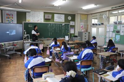 算数の授業では、「比例と反比例」の復習問題に取り組みました。先生から配られたプリントをじっくりと解いていました。その後、友達同士で分からない問題を一緒に考えたり、教え合ったりして確認をしていました。
