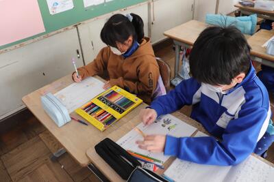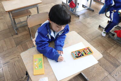 図画工作の授業では、「冬休みの思い出について絵を描こう」ということで、冬休み中に印象に残った出来事などを思い返して画用紙に絵を描きました。冬休み中は、クリスマスやお正月など大きなイベントがあったり、家族と過ごす時間が多かったりといろいろなことを思い返していました。