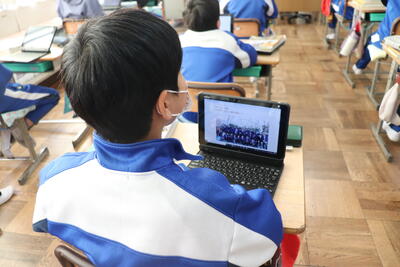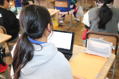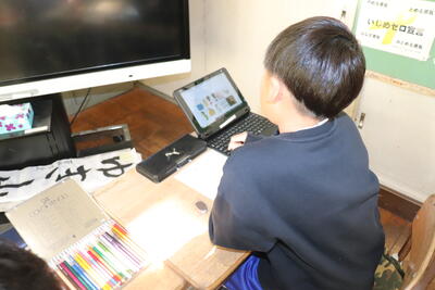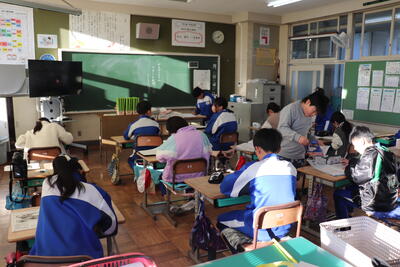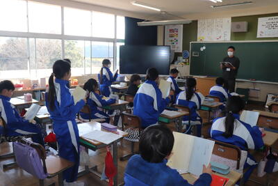 外国語の授業では、「英語で交流しよう」ということで、隣の小学校と英語で対話をしました。以前、オーストラリアの児童と行ったことがあるので、対話はスムーズにすすみました。終わったら、振り返りとしてタブレットに感想を打ち込みました。外国語(英語)の授業での交流でしたが、4月からは小見川中学校で一緒に生活する仲間なので、よい機会となりました。