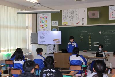 総合的な学習の時間では、これまで各自でテーマを決めて、パワーポイントにまとめた資料をクラスのみんなに発表しました。とても丁寧にまとめていてわかりやすかったです。発表の後の質問にもしっかりと応えていました。