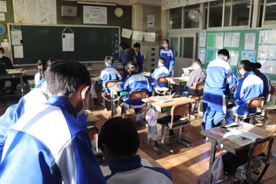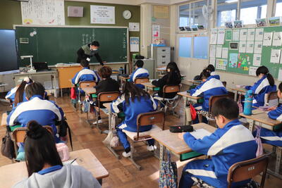 学級活動の時間では、提出物の確認をしました。次の外国語の授業では、授業の冒頭に冬休みで印象に残ったことを発表しました。(日本語)その後、「スリーヒントクイズ」ということで英語で書かれた3つの言葉から都道府県を当てるクイズに挑戦しました。(答えに千葉県や静岡県等がありました)