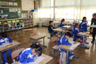国語の授業では、「感謝の手紙」ということで、担任の先生が用意してくれたプリントに、児童が感謝を伝えたい人に向けた手紙を書いていました。手紙が完成したらそれぞれの人に送るそうです。いただいた人は、きっと喜んでくれるでしょう。