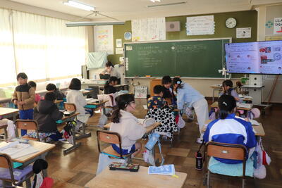 先週金曜日の算数に引き続き、本日午後に国語科の校内研究会があり、4年生で「ごんぎつね」を題材に授業を行いました。音読から始まり、「ごん」の心情の変化を中心にグループで話し合って発表し、最後に振り返りをタブレットに打ち込みました。授業の終盤、単元の最初にアプリで打ち込んだ「ふきだしくん」を使って電子黒板に映し出された疑問点について考えを深めました。児童は音読や話し合い活動に積極的に取り組んでいて素晴らしかったです。放課後、先生方で授業の振り返りを行いました。最後に千葉県教育庁北総教育事務所の指導主事の先生より、「話し合い活動」を中心に丁寧で幅広い視点からのご指導をいただきました。