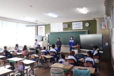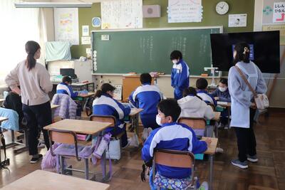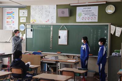 外国語の授業では、英語のヒントから千葉県内にある施設をあてるクイズに挑戦していました。児童は、積極的に手を挙げて発表していました。東京ディズニーリゾートや成田空港などがあり、ほとんど正解することができました。(答えも英語で答えていました)