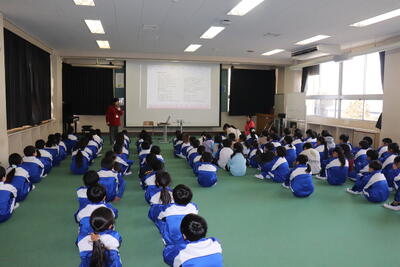 本日、1年生が地域の保育園と交流学習を行いました。まず、2時間目の初めに学校探検を行い、なかよしタイムは園児と一緒に校舎内または校庭で遊びました。その後、3時間目は体育館でレクリエーションを行い交流を深めました。1年生にとってお兄さん、お姉さんとして接することができて、とてもよかったです。