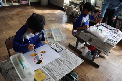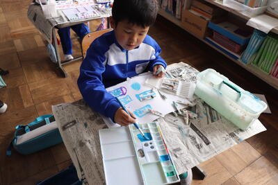 図画工作の授業では、「できたらいいな こんなこと」という内容を学習しました。これは、児童がいいなと思うことを絵に描いて表現するものです。様々なことを想像して自由に絵を描いていました。