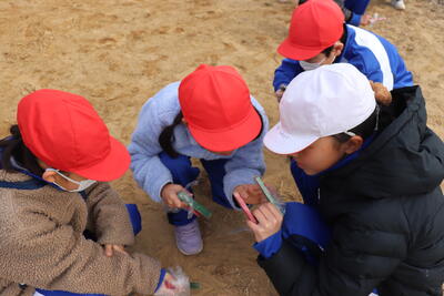 理科の授業では、磁石を使った内容について学習しました。校庭の砂場を中心に磁石を手に持って砂鉄を集めていました。集めた砂鉄は、ペットボトルに移して今後の実験に使用するそうです。