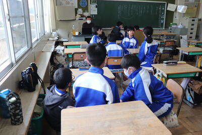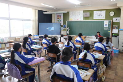 音楽の授業では、はじめに卒業式に向けて北小の校歌を歌いました。普段歌っている音程とは違ってハーモニーになるように教科担任の先生から説明がありました。普通の音程とは違うものでしたが、電子ピアノの音を聴きながら歌いました。