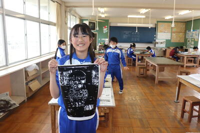 図画工作の授業では、版画を行いました。彫刻刀で彫るのが終わった児童から刷り始めました。完成した作品をみてうれしそうでした。今回、彫刻刀を使って彫る作業がほとんど終わったので、次回はほぼ全員が刷ることができるとのことでした。