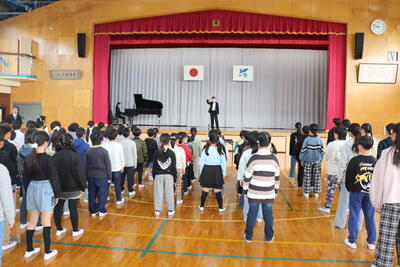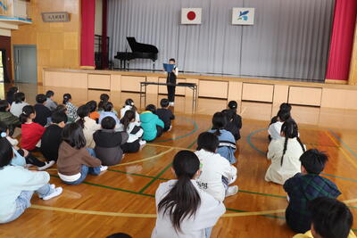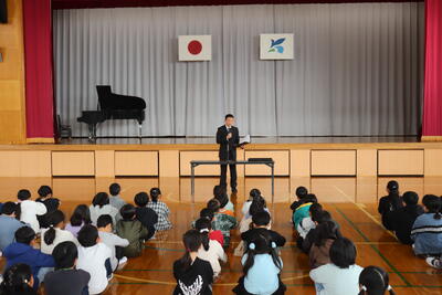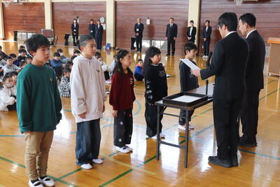 校歌を歌った後、5年生の児童が代表が後期を振り返ってを発表しました。その後各クラスの代表に修了証(通知表)が手渡されました。校長先生から1学年ずつ全クラスへ向けて話があり、最後に「新年度に向かって目標をもって取り組んで欲しい。」というお願いがありました。