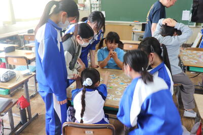 生活科の授業では、6年生とカルタをして交流をしました。体育の授業では、2年生とグラウンドで合同で行い、体ほぐしの運動で一緒に楽しく活動しました。