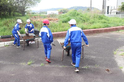 理科の授業では、この後に種を植える植物(3種類で秘密だそうです)のために、ポットに土を入れました。3年生の分まで作っていました。(優しいですね!)