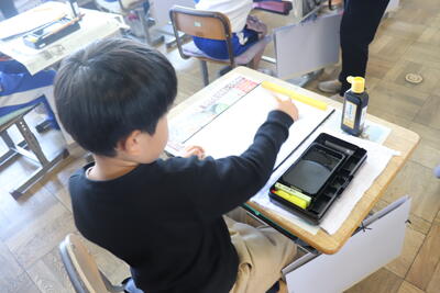 図画工作の授業では、図工室で色々な模様をつくっていました。画用紙に絵の具を垂らしてから吹いて伸ばしたり、絵の具を着けたビー玉を転がしたりして様々な模様を楽しく描いていました。