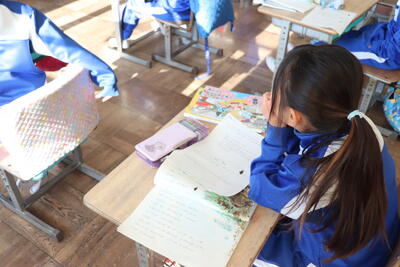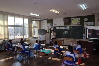 国語の授業では、「スイミー」の続きを行いました。担当の先生が用意してくれたプリントに魚たちの気持ちの変化を書き込んですすんで発表しました。友達の意見を聞いたり、比較したりすることで気持ちの変化について理解を深めることができました。