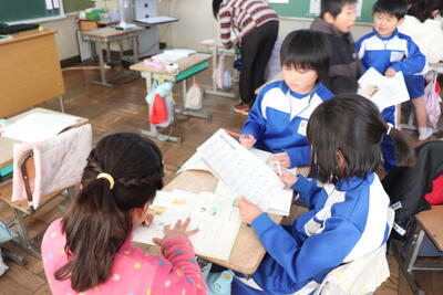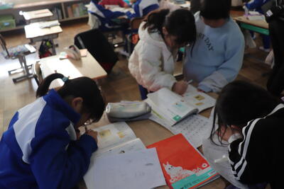 国語の授業では、「漢字の広場」を学習しました。同じ読みでも違う漢字について、調べたり、グループで確認しあったりしながら答えを書きました。1つのよみについて5つくらいの種類の漢字があったので大変でしたが、児童は意欲的に取り組んでいました。
