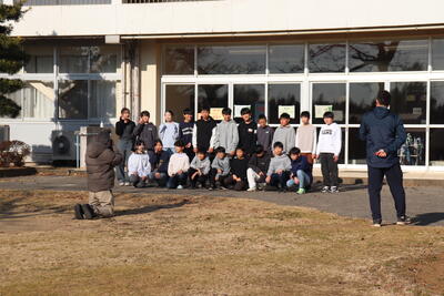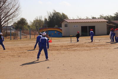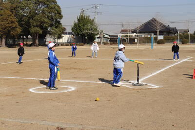 体育の授業では、引き続き「ベースボール型」を行いました。ティーと呼ばれる台座にボールを乗せて前後半で攻撃と守備を行い、点数を多くとったチームの勝ちとなるルールです。風が強く吹く中、元気に取り組んでいました。