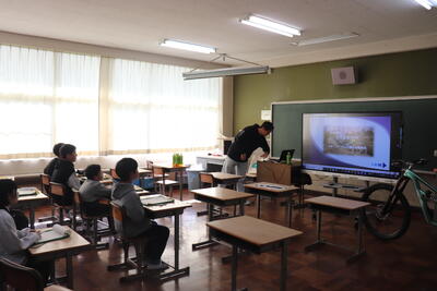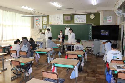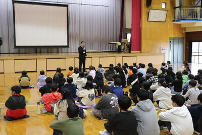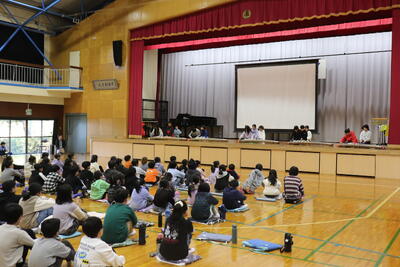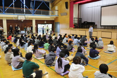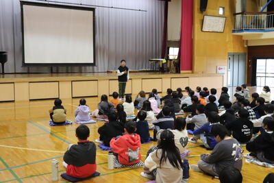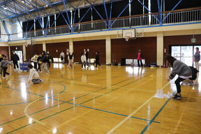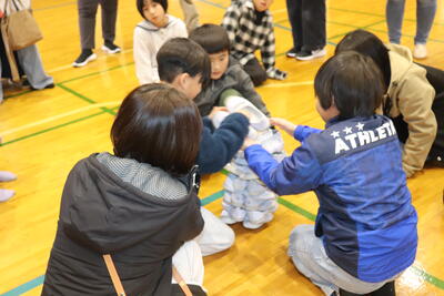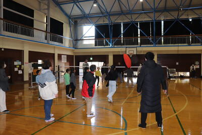 続いて「地域交流会」に移りました。低学年は2階で、講師の方2名をお招きして「けん玉」を行いました。たくさんの技を披露してくださいました。その後、けん玉を使ったゲームをして楽しみました。中学年は体育館で、「ヘルスバレーボール」「ペットボトルボーリング」「上靴積み」の3つをローテーションで行い、最後に紙飛行機を飛ばしました。5年生は若鯉広場で、講師の方をお招きして「認知症」について講演をいただきました。高学年は、講師の方3名をお招きして様々な職業について教えていただきました。