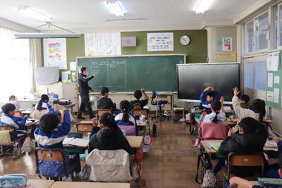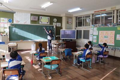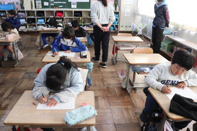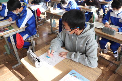 国語の授業では、漢字の書き取りを行いました。「町」という漢字など、担任の先生の号令とともに書き順どおり書いてから、実際に漢字ドリルに書き込みました。1年生でならう漢字80字、もうすぐ修了となります。