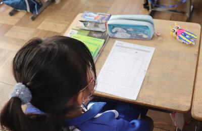 国語の授業では、授業の冒頭に視写を行いました。担任の先生から配付された作文用プリントを使い、決められた時間内で正確にプリント半分の文章を書き写します。始めたころよりもたくさんの文字を写すことができるようになってきました。