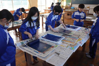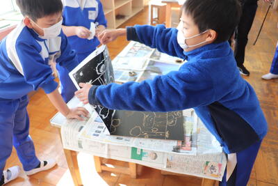 図画工作の授業では、「版画」を行いました。ここまで木版に彫り込んだデザインにインクを塗り、紙に写しました。黒のインクと青のインクで印刷しました。できあがった作品は、児童が彫り込んだ線が一本一本浮かび上がっていてとてもきれいでした。また、同じデザインでも、色が違うだけでイメージが変わることがわかりました。