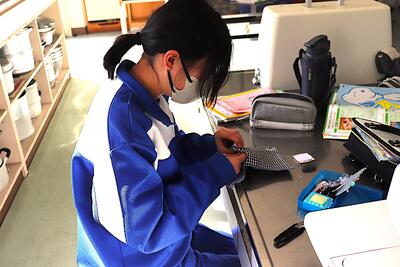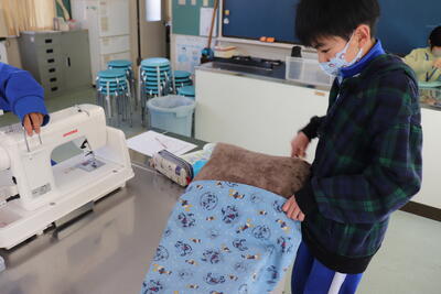 家庭科の授業では、「裁縫」について行いました。クッションカバーのような大きいものやティッシュカバーのような小物まで、各自で考えた作品が仕上がりました。大きい所はミシンを使い、細かい所は、手縫いで行っていました。自分で作った作品は、使用する際に愛着がわきますね。