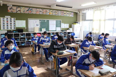 国語の授業では、ここまで学習した「日本語の文字」について確認しました。「日本語の文字」には、「漢字」「万葉仮名」「平仮名と片仮名」等があること等、担任の先生が黒板にこれまでの内容を書くと、各自がノートにまとめました。