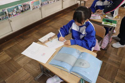国語の授業では、「動物に関する絵本の紹介」について学習しました。担任の先生が用意してくれた絵本を読みながら、紹介文と絵をプリントにまとめました。いろいろな種類の動物に関する紹介と可愛らしい絵を見て絵本が読みたくなりました。最後にプリントを色紙に貼って動物紹介の掲示物が完成しました。